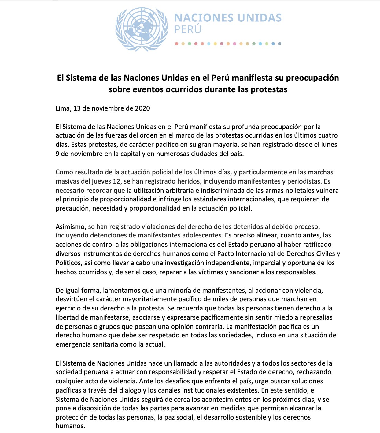 El Sistema de las Naciones Unidas en el Perú manifestó su profunda preocupación por la actuación de las fuerzas del orden en el marco de las protestas ocurridas, «de carácter pacífico en su gran mayoría», en los últimos cuatro días en la capital y en numerosas ciudades del país.