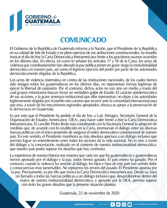 Según el documento, por esta razón Giammattei pidió al secretario General de la OEA, Luis Almagro, hacer valer la Carta Democrática Interamericana, y el canciller Pedro Brolo está coordinando para la adopción de medidas que, «de acuerdo con lo establecido en la Carta, promuevan el diálogo entre diversas fuerzas políticas» del país.