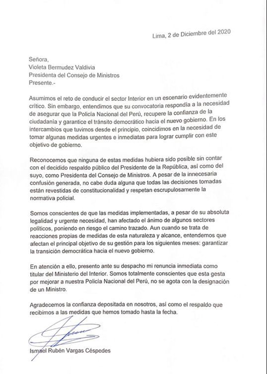 En el documento de renuncia dirigido a Bermúdez Valdivia, Vargas refirió que asumió el reto de conducir el sector Interior en un escenario evidentemente crítico.