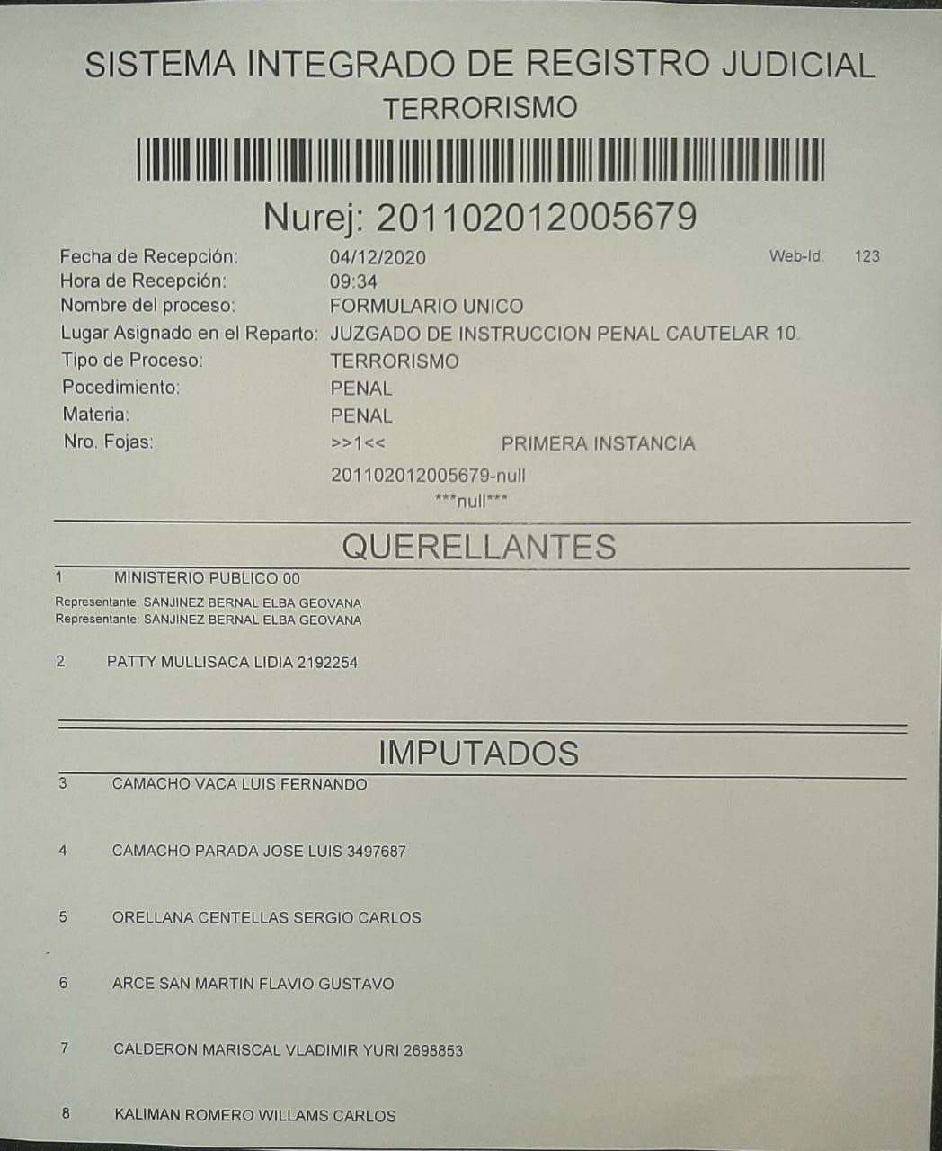En días pasados, la exdiputada masista Lidia Patty presentó una denuncia formal contra Luis Fernando Camacho y el padre de este, José Luis Camacho, por los «hechos ilícitos» de terrorismo (Artículo 133 del Código Penal), sedición (Artículo 123) y conspiración (artículo 126) que conllevaron a una conmoción social en el país.