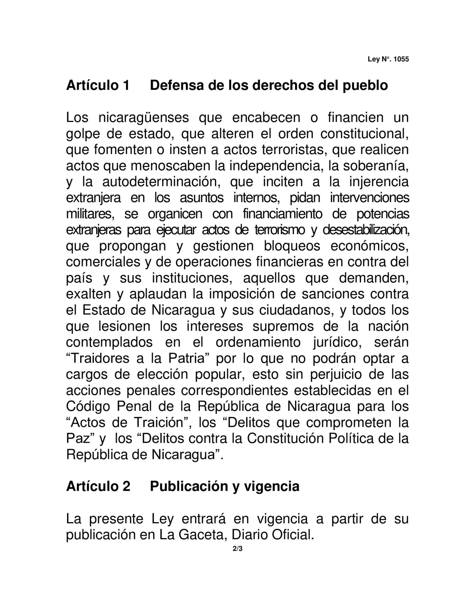 “Los nicaragüenses que encabecen o financien un golpe de estado, que alteren el orden constitucional, que fomenten o insten a actos terroristas, que realicen actos que menoscaben la independencia, la soberanía, y la autodeterminación, que inciten a la injerencia extranjera en los asuntos internos, pidan intervenciones militares, se organicen con financiamiento de potencias extranjeras para ejecutar actos de terrorismo y desestabilización, que propongan y gestionen bloqueos económicos, comerciales y de operaciones financieras en contra del país y sus instituciones, aquellos que demanden, exalten y aplaudan la imposición de sanciones contra el Estado de Nicaragua y sus ciudadanos, y todos los que lesionen los intereses supremos de la nación contemplados en el ordenamiento jurídico, serán “Traidores a la Patria” por lo que no podrán optar a cargos de elección popular, esto sin perjuicio de las acciones penales correspondientes establecidas en el Código Penal de la República de Nicaragua para los “Actos de Traición”, los “Delitos que comprometen la Paz” y los “Delitos contra la Constitución Política de la República de Nicaragua”, leyó el Artículo 1 “Defensa de los derechos del pueblo”.