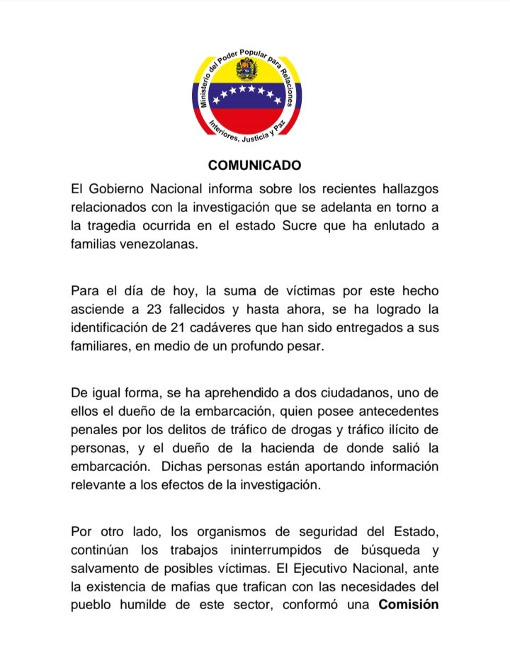 A través de un comunicado, el Gobierno nacional informó sobre los recientes hallazgos relacionados con la investigación que se adelanta en torno a la tragedia ocurrida Güiria, estado Sucre, que ha enlutado a familias venezolanas.