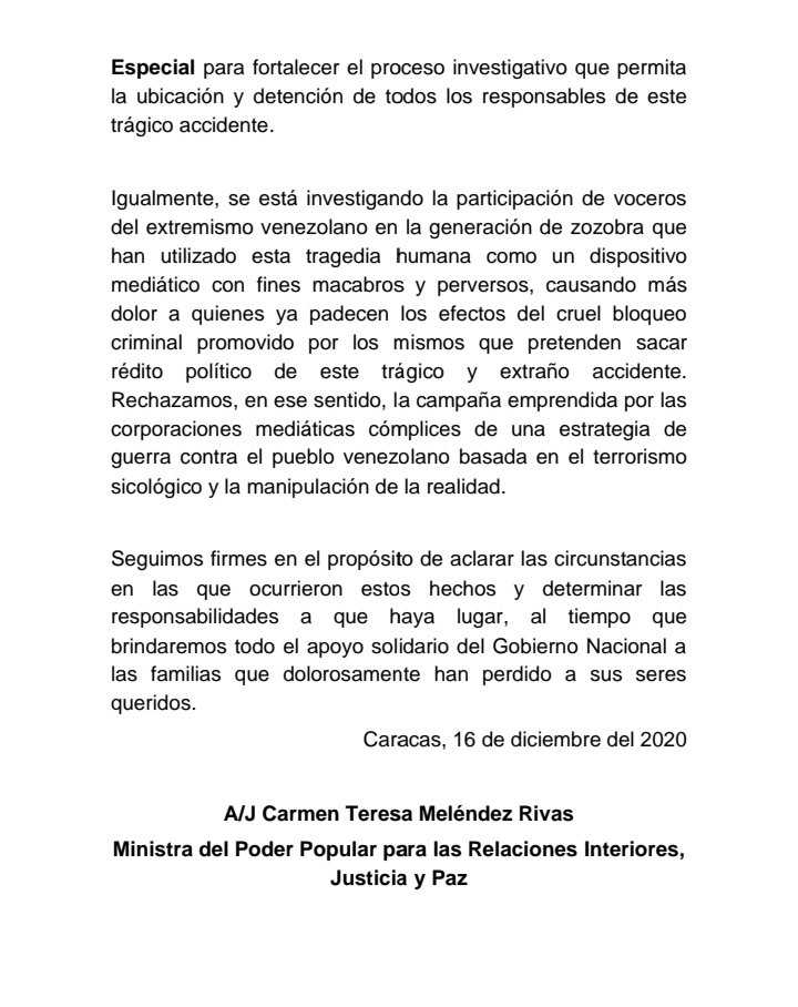 “Se está investigando la participación de voceros del extremismo venezolano en la generación zozobra que han utilizado esta tragedia humana como dispositivo mediático con fines macabros y perversos”, indica el comunicado.