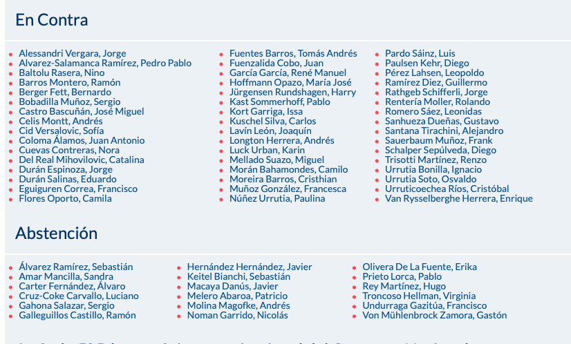 Por 76 votos a favor (necesitaba 89), 48 en contra y 18 abstenciones, la Sala de la Cámara Baja se opuso al proyecto que quería fomentar el conocimiento, comprensión y compromiso de las y los estudiantes sobre los Derechos Humanos en el Plan de Formación Ciudadana para los establecimientos reconocidos por el Estado.