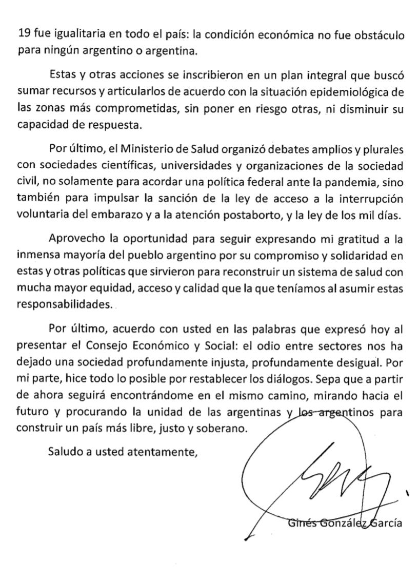 El escándalo tomó por sorpresa al Jefe de Estado quien, tras el lanzamiento del Consejo Económico y Social en el Centro Cultural Kirchner, mantuvo un tenso diálogo con el titular de la cartera sanitaria en donde le pidió explicaciones. Según fuentes de Casa Rosada, la respuesta de González García «no convenció al presidente». Por este motivo, Fernández instruyó al Jefe de Gabinete de la Nación, Santiago Cafiero, que se formalice la renuncia.