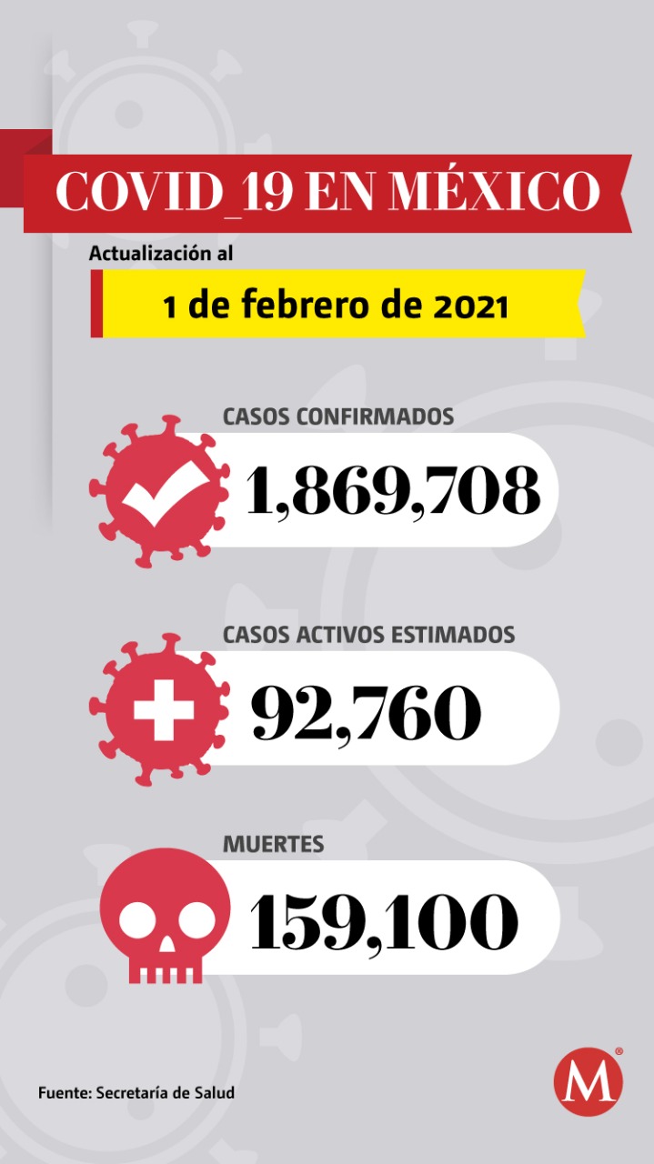 México suma 159 mil 100 muertes por covid-19 hasta este lunes 1 de febrero y un millón 869 mil 708 casos acumulados, de acuerdo con la información proporcionada por la Secretaría de Salud.