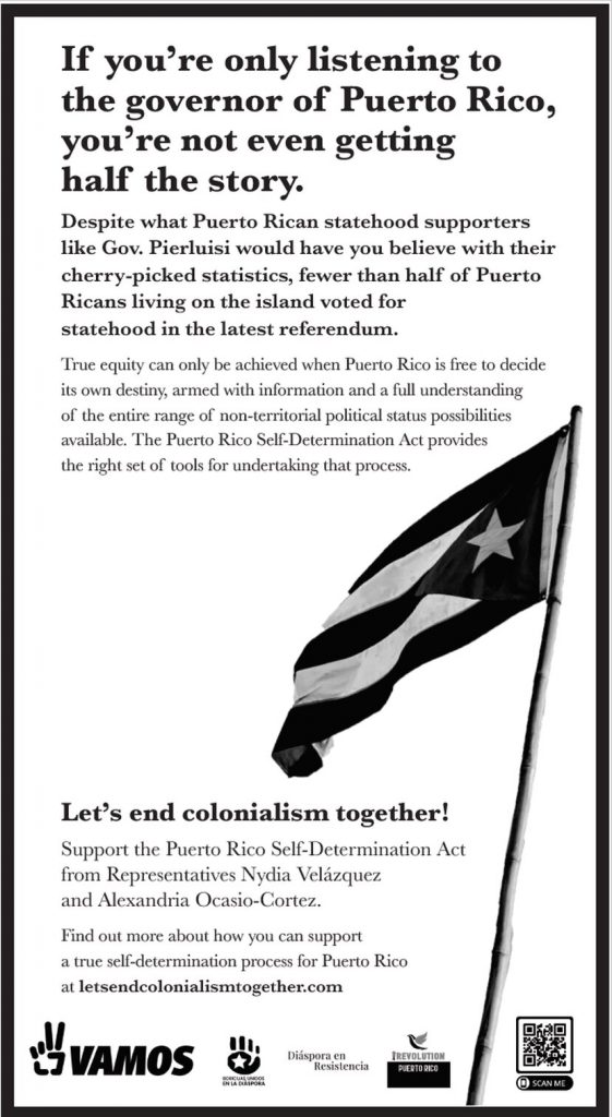 “A pesar de lo que los partidarios de la estadidad puertorriqueña como el gobernador Pierluisi le harían creer con su estadísticas seleccionadas, menos de la mitad de los puertorriqueños que viven en la isla votaron por la estadidad en el último referéndum”, agrega el anuncio, en el que se exhorta a los lectores a visitar la página de internet letsendcolonialismtogether.com .