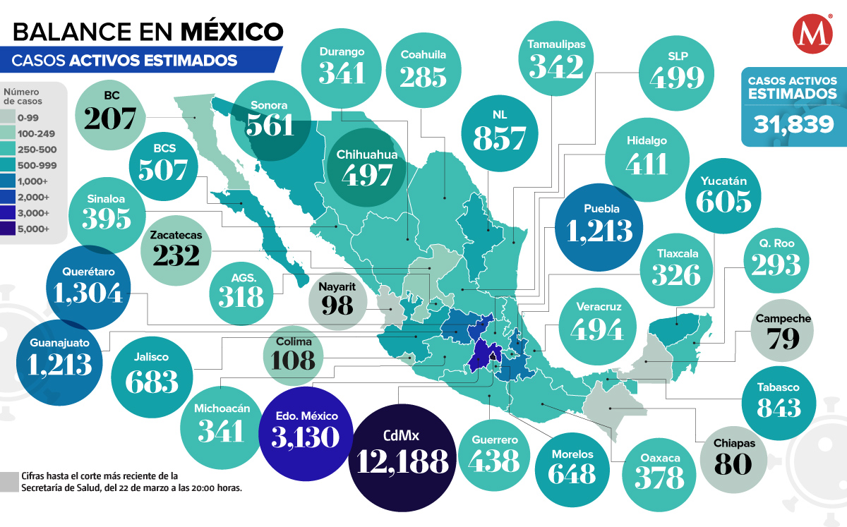 La Ciudad de México y el Estado de México son las entidades con la mayor cantidad de casos activos estimados de coronavirus; mientras que Campeche tiene la menor cifra.