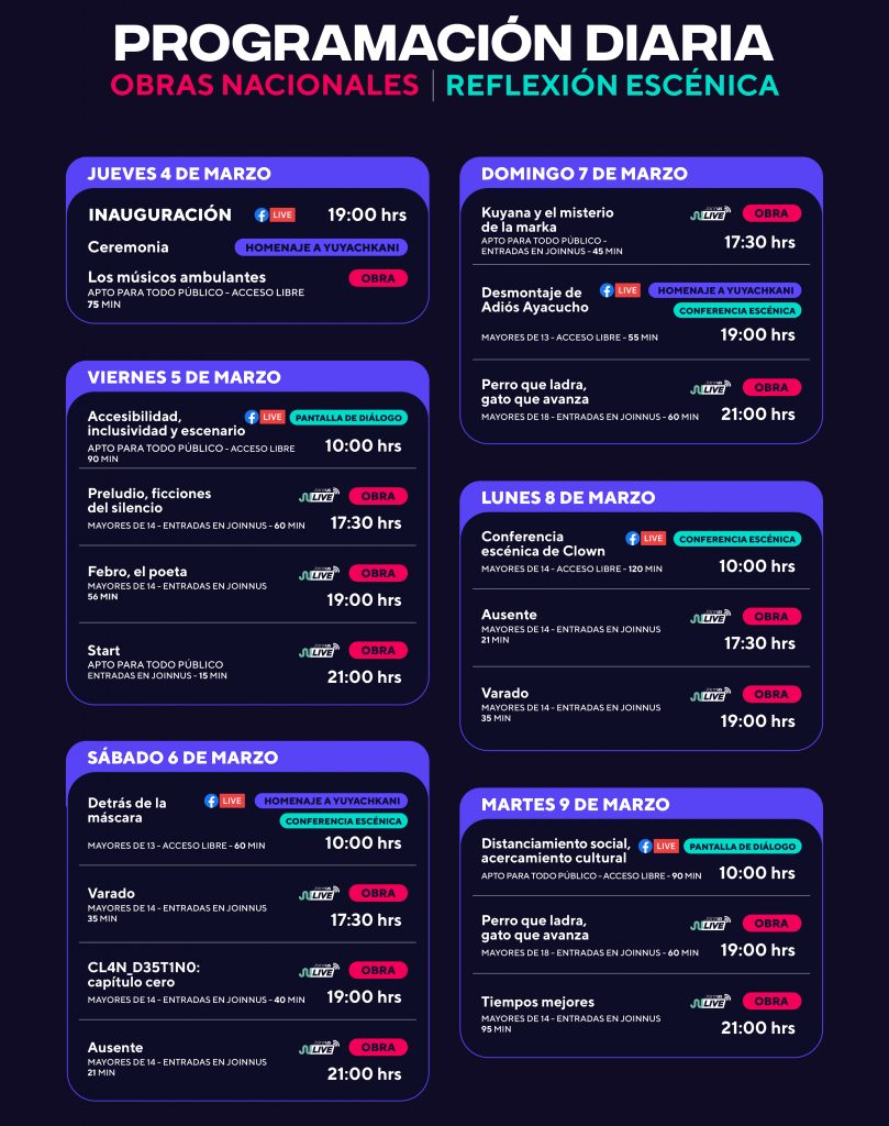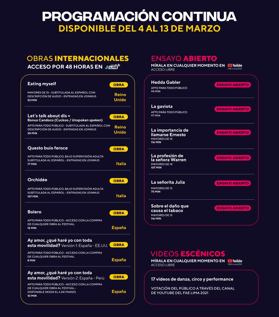 Las presentaciones virtuales del 5° FAE Lima se podrán seguir a través de la página de Facebook del festival o su canal de Youtube. Para las obras que se verán de manera presencial las localidades de compran a través del sitio joinnus