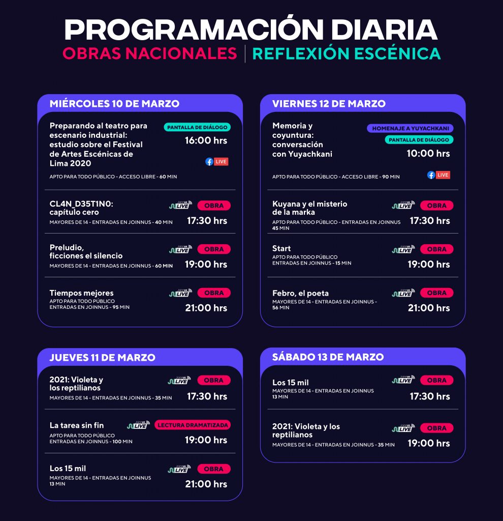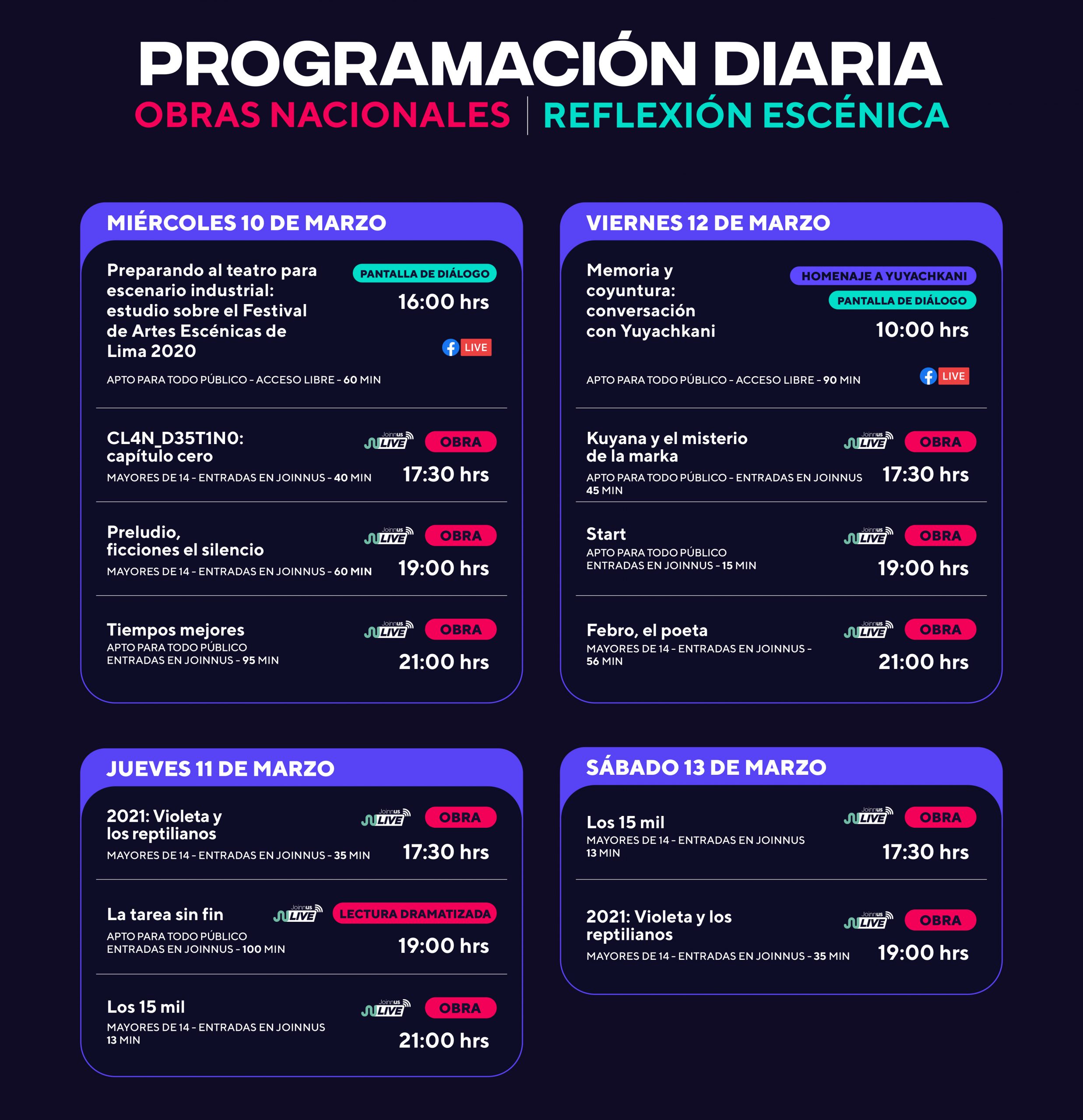 La Programación Nacional tendrá 5 secciones: Coproducción FAE Lima, Selección 2020, Lectura dramatizada, Ensayo abierto y Video escénico. La Programación Internacional presentará obras de España, Italia y el Reino Unido.