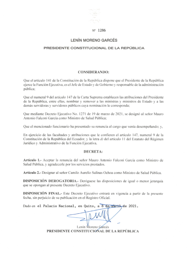 Mauro Falconí dejó su cargo en el Ministerio de Salud Pública (MSP), sin llegar a los 20 días, este miércoles 7 de abril del 2021. Fue nombrado el viernes 19 de marzo, en reemplazo de Rodolfo Farfán, quien permaneció un período similar en ese puesto. Camilo Salinas se convierte en el quinto ministro en enfrentar la pandemia.