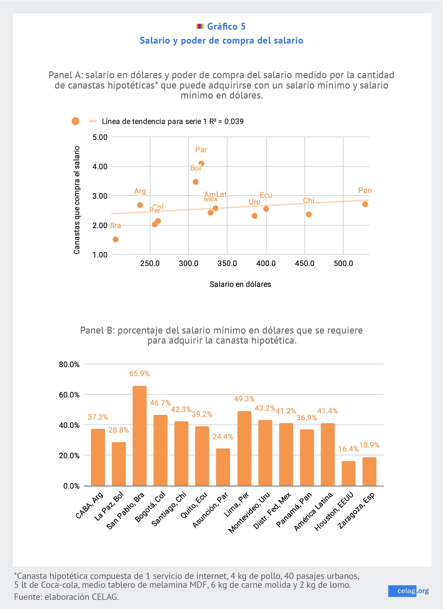 - Esta situación implica que las economías latinoamericanas pueden tener salarios altos en dólares, pero bajos en poder adquisitivo, como son los casos de Panamá, Chile, Ecuador y Uruguay, todos con salarios cercanos o superiores a los 400 dólares mensuales y, sin embargo, tienen la misma capacidad de compra que Argentina cuyo salario es mucho menor, y mucha menos capacidad de compra que Bolivia y Paraguay que tienen salarios en dólares menores (gráfico 5).