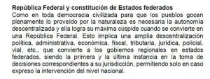 En los capítulos referidos al camino hacia una nueva Constitución y la descentralización, el plan de gobierno de Perú Libre plantea el cambio de un “Estado centralista” a una “república federal que beneficie al sector público y privado”. “Esto implica una amplia descentralización política, administrativa, económica, fiscal, tributaria, jurídica, policial, vial, etc., que convierte a los gobiernos regionales en estados federados, siendo la primera y la última instancia en la toma de decisiones correspondientes a su jurisdicción, permitiendo solo en caso expreso la intervención del nivel nacional”, dice la propuesta.