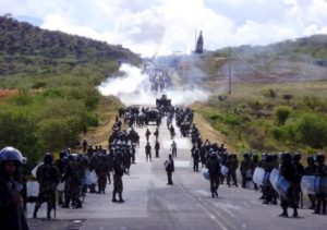 Enfrentamiento entre las comunidades campesinas y la policía por proyecto Las Bambas en Perú. Foto: Observatorio de Conflictos Mineros.
