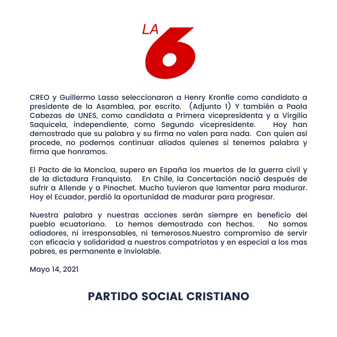 El Partido Social Cristiano-Madera de Guerrero anunció este 14 de mayo la ruptura de la alianza con el gobierno de Guillermo Lasso, que asumirá el cargo el próximo 24 de mayo, por no respetar el acuerdo legislativo en el que también participaba la bancada Unión por la Esperanza (UNES).