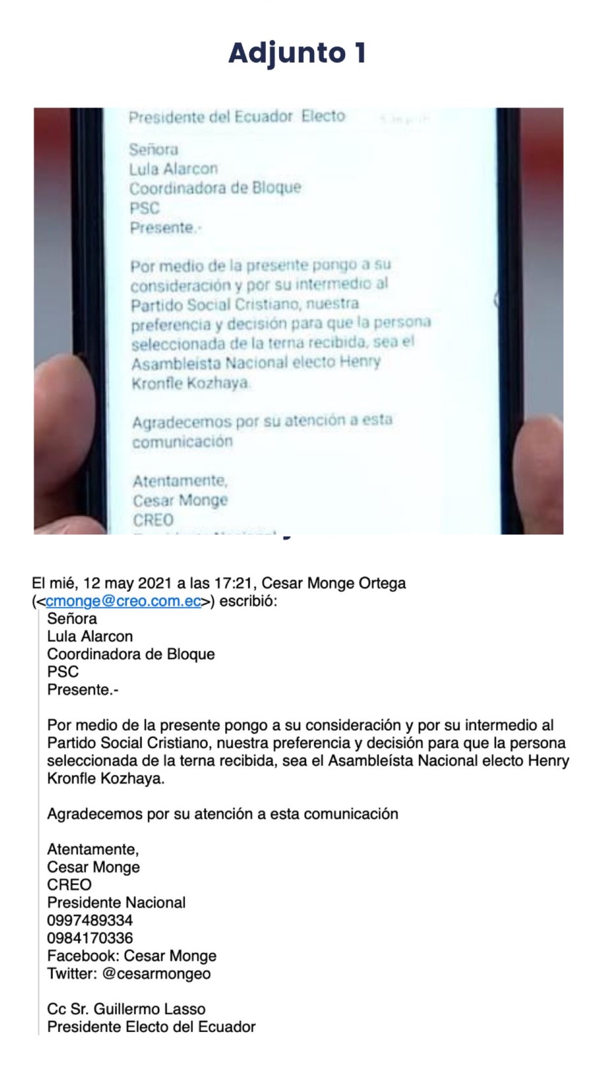 “CREO y Guillermo Lasso seleccionaron a Henry Kronfle como candidato a Presidente de la Asamblea, por escrito. (Adjunto 1) Y también a Paola Cabezas de UNES, como candidata a Primera Vicepresidenta y a Virgilio Saquicela, independiente, como Segundo Vicepresidente”.