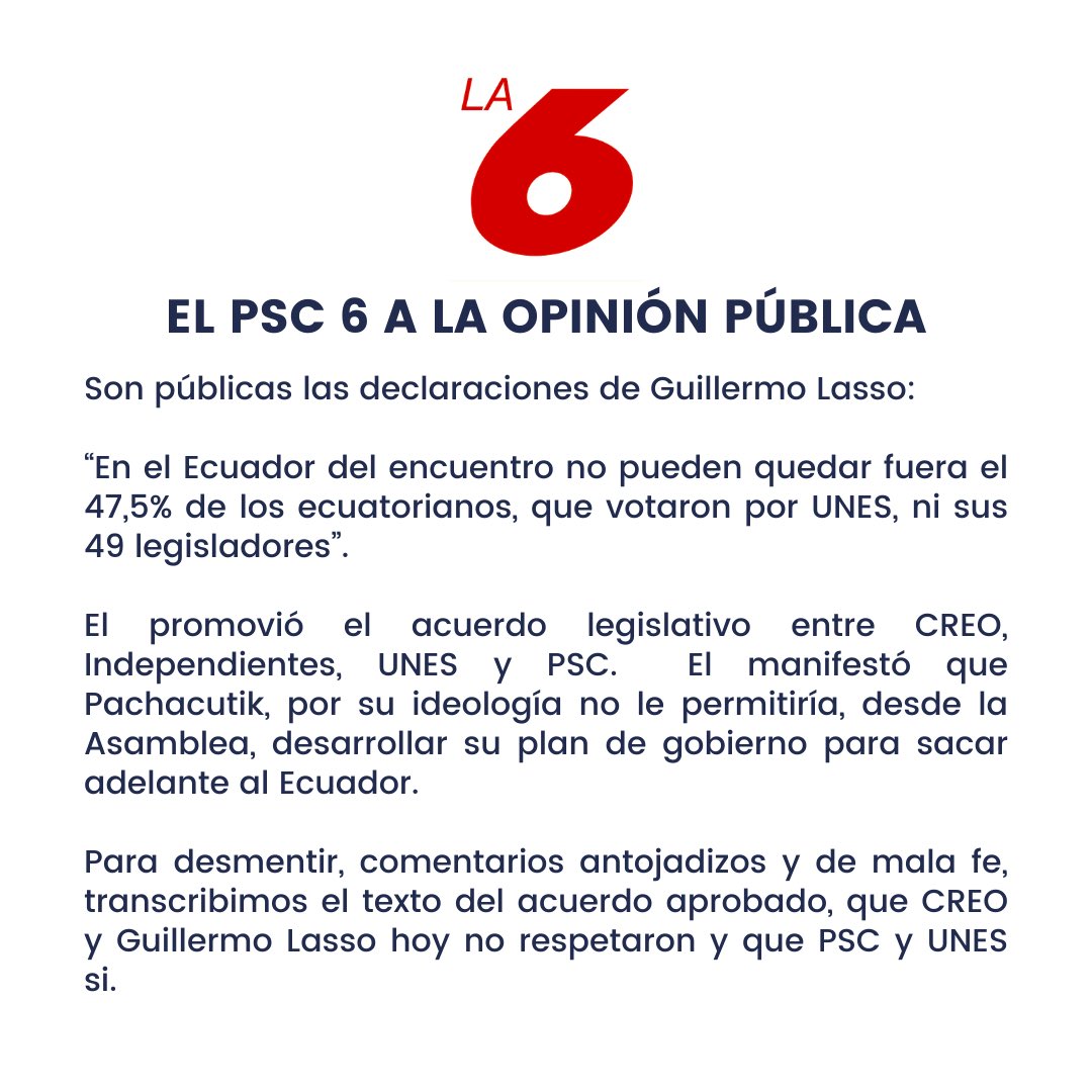 En el documento señala que, para desmentir comentarios antojadizos y de mala fe, transcriben el texto del acuerdo aprobado, que CREO y Guillermo Lasso no respetaron; en tanto que el PSC y UNES, sí. La siguiente es la transcripción del documento: