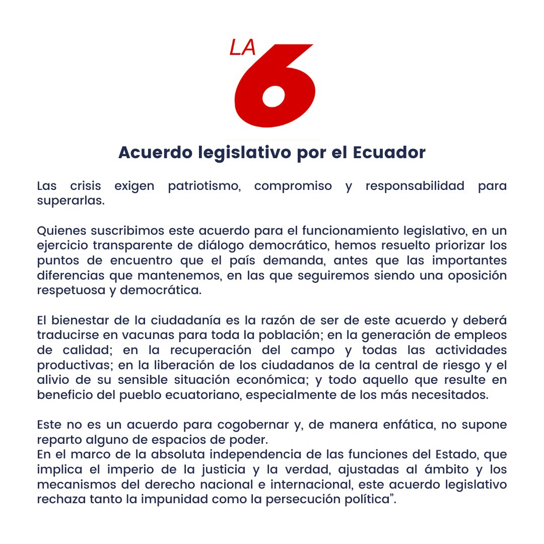 “El bienestar de la ciudadanía es la razón de ser de este acuerdo y deberá traducirse en vacunas para toda la población; en la generación de empleos de calidad; en la recuperación del campo y todas las actividades productivas; en la liberación de los ciudadanos de la central de riesgo y el alivio de su sensible situación económica; y todo aquello que resulte en beneficio del pueblo ecuatoriano, especialmente de los más necesitados».