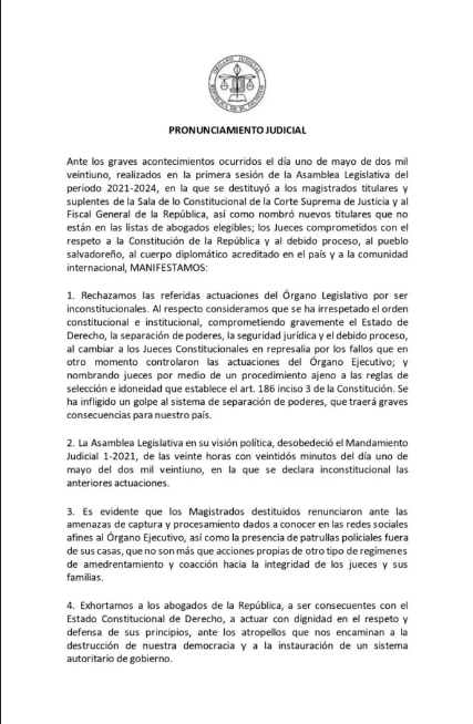 Los jueces del sistema judicial salvadoreño publicaron hoy un comunicado de prensa en el que mostraron su inconformidad con la decisión de la Asamblea Legislativa de destituir a los miembros de la Sala de lo Constitucional y nombrar nuevos magistrados.