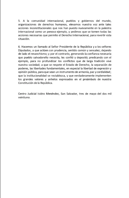 «La Asamblea Legislativa en su visión política, desobedeció el Mandamiento Judicial 1-2021, de las veinte horas con veintidós minutos del día uno de mayo del dos mil veintiuno, en la que se declara inconstitucional las anteriores actuaciones (la destitución de lo magistrados Armando Pineda, Aldo Cáder, Carlos Sánchez, Carlos Avilés y Marina de Jesús Marenco).