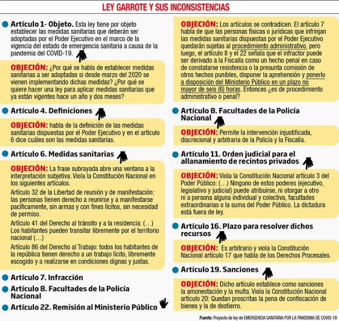 La Mesa de Presidentes de los Partidos de Oposición al gobierno colorado publicaron un manifiesto de repudio contra el anteproyecto de ley del presidente Mario Abdo que crea un marco legal para las medidas sanitarias y punitivas mientras dure la pandemia del COVID-19 en Paraguay.