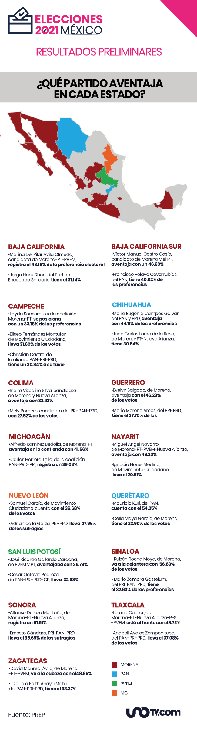 Morena se llevaría 11 gubernaturas; PAN, 2; ve resultados preliminares de los 15 estados