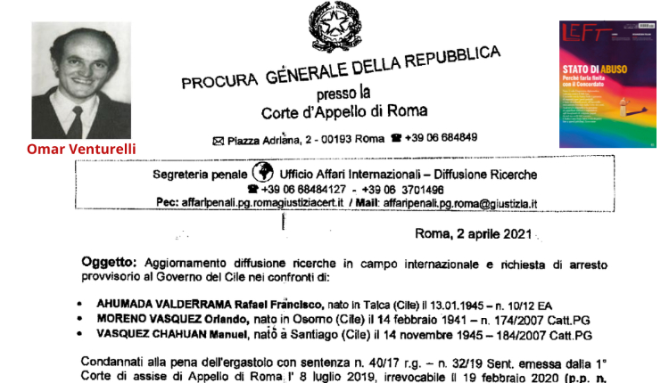 Mientras tanto, ya fueron enviadas al Gobierno chileno las órdenes de arresto para Ahumada Valderrama, Moreno Vásquez y Vásquez Chahuan, condenados por la Fiscalía de Roma por homicidio y la desaparición de los cuerpos de los italianos Omar Venturelli y Juan José Montiglio.