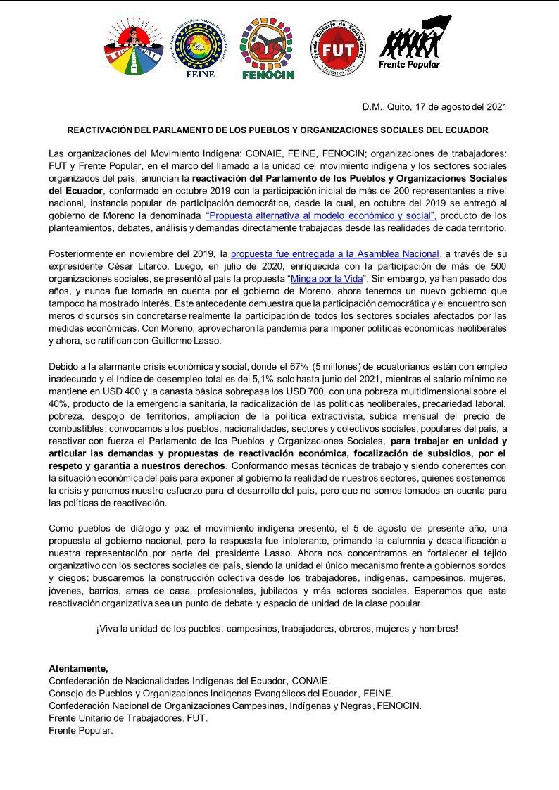 — CONAIE (@CONAIE_Ecuador) August 18, 2021