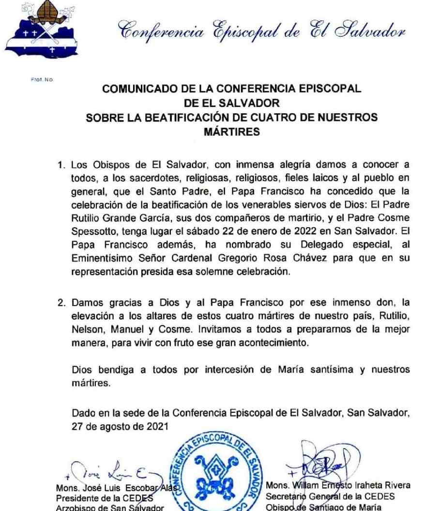 Según la información, además de los tres mártires, quienes fueron asesinados el 12 de marzo de 1977 en El Paisnal, al norte de San Salvador, también será beatificado el padre italiano Cosme Spessotto, quien también fue asesinado en 1980 en San Juan Nonualco, La Paz.