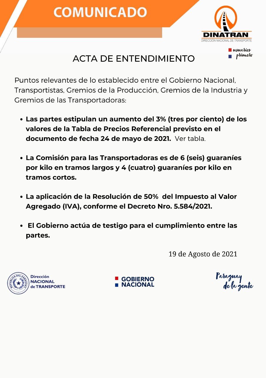 «El Gobierno Nacional, con la mediación de distintas instituciones, logra levantar el paro de camioneros, tras firmar el acta de entendimiento sobre el precio del flete», confirmó a través de su cuenta de Twitter la Dirección Nacional de Transporte (Dinatrán).