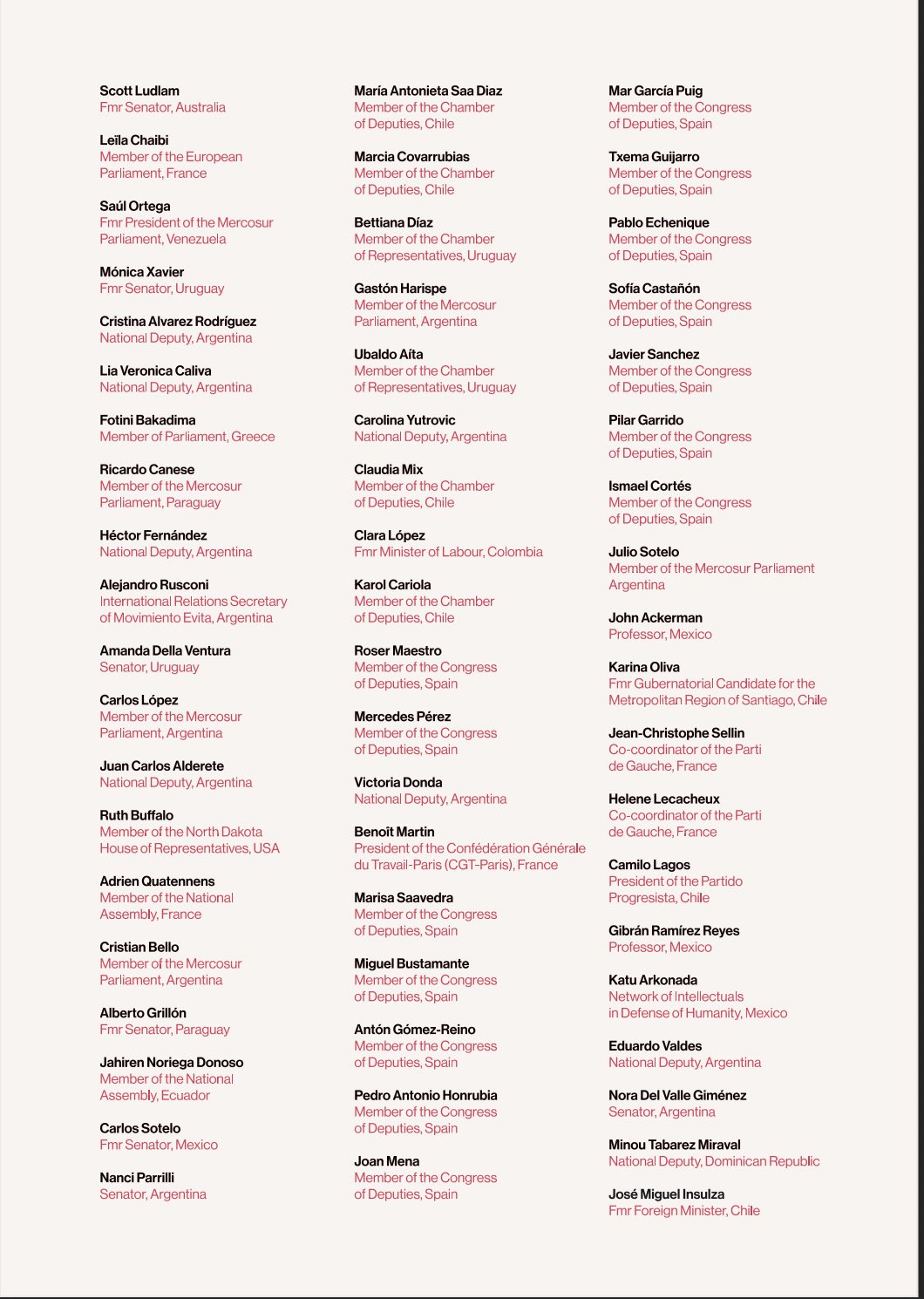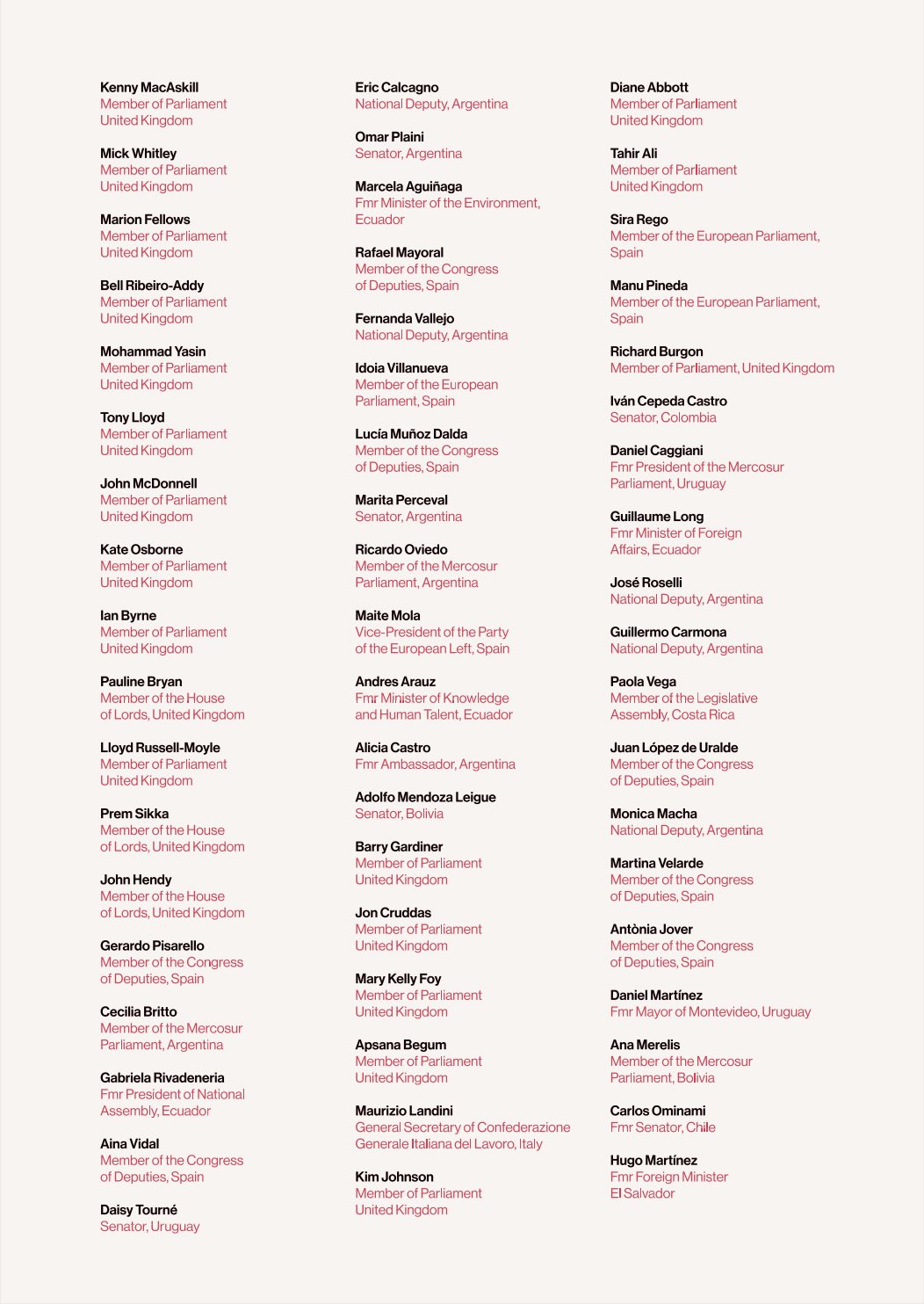 Adhieren los diputados Eduardo Valdes, Victoria Donda, Fernanda Vallejos, Guillermo Carmona, Eric Calcagno, José Roselli, Monica Macha, Cristina Alvarez Rodríguez, Lia Veronica Caliva, Héctor Fernández, Juan Carlos Alderete y Carolina Yutrovic; de Colombia María José Pizarro; y de Francia Jean-Luc Melenchon. Por el Parlasur firman desde Argentina el vicepresidente Oscar Laborde y los diputados Gastón Harispe, Julio Sotelo, Cristian Bello, Carlos López, Ricardo Oviedo y Cecilia Britto.