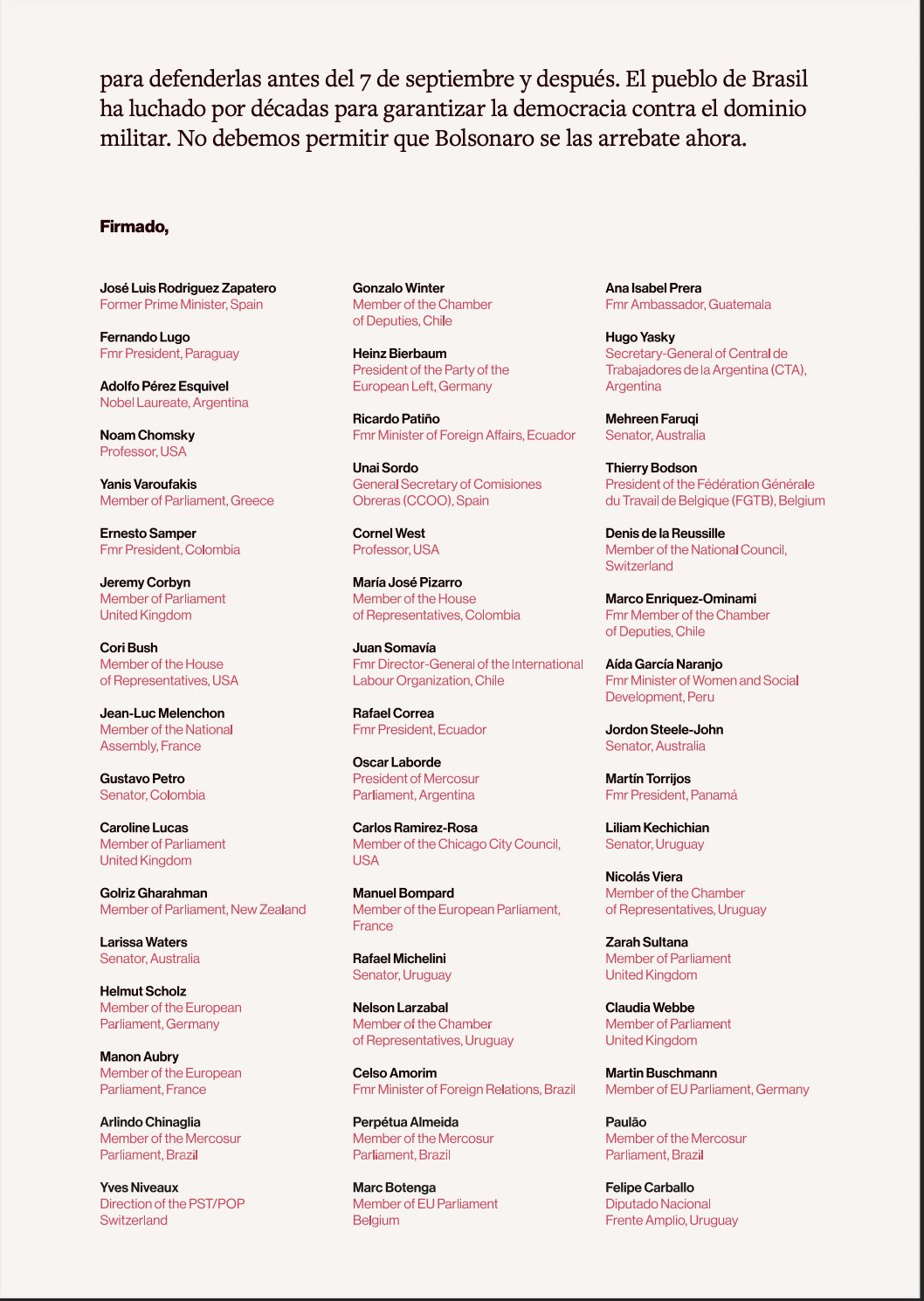 Expresidentes, académicos y líderes mundiales advirtieron que el 7 de septiembre de 2021 «una insurrección pondrá en peligro la democracia en Brasil». Entre más de 100 firmas, la carta abierta cuenta con el respaldo del premio Nobel de la Paz Adolfo Pérez Esquivel, el lingüista estadounidense Noam Chomsky, el expresidente de Ecuador, Rafael Correa, y el excanciller de Brasil, Celso Amorim. Está previsto que el este martes, Día de la Independencia brasileña, seguidores del presidente Jair Bolsonaro protesten en ciudades como Brasilia y San Pablo contra los jueces de la Corte Suprema, uno de los principales blancos de las críticas del mandatario. El propio Bolsonaro dijo días atrás que en esa convocatoria «el pueblo» le dará «un ultimátum a quienes desafían a la Constitución».