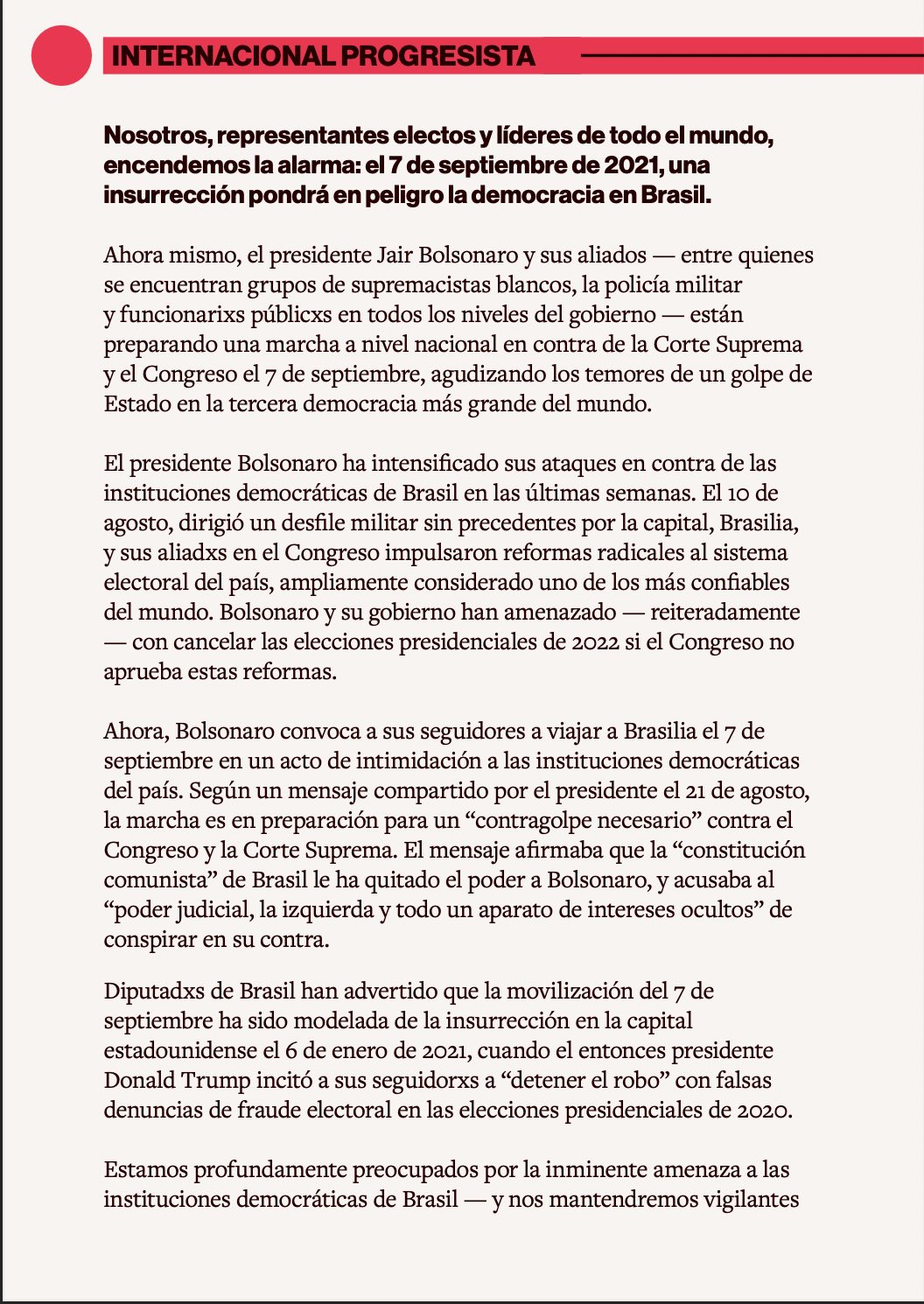 O texto alerta que «Bolsonaro e seus aliados – incluindo grupos supremacistas, policiais militares e funcionários públicos, em todos os níveis do governo – estão preparando uma marcha nacional contra a Suprema Corte e o Congresso em 7 de setembro, alimentando temores de um golpe na terceira maior democracia do mundo».
