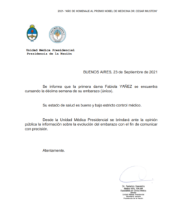 A través de un comunicado, el Gobierno confirmó la noticia relacionada con la pareja presidencial. En el texto entregado por la Unidad Médica Presidencial sostuvieron que la Primera Dama cursa su décimo mes de embarazo. En el comunicado, además, reveló: «El estado de salud es bueno» y, además, que está «bajo estricto control médico».