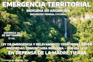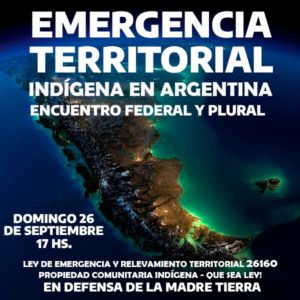 Luego de la primer jornada federal y plural, realizada el domingo 5 septiembre, y de haber realizado los días 18 y 19 encuentros de las regiones NEA, NOA, Centro y Patagonia. Este domingo 26 de septiembre a las 17 hs., nos convocamos nuevamente en un último encuentro a debatir e informarnos sobre la EMERGENCIA TERRITORIAL INDÍGENA en Argentina.