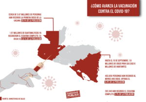 Según esas proyecciones, en Guatemala, solo un 33 % de la población habría recibido para esa fecha al menos una dosis de la vacuna contra el covid-19, mientras que solo un 18% tendría las dos dosis o pauta completa.