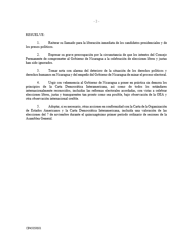 Además expresan «su grave preocupación por la circunstancia de que los intentos del Consejo Permanente de comprometer al Gobierno de Nicaragua a la celebración de elecciones libres y justas han sido ignorados».
