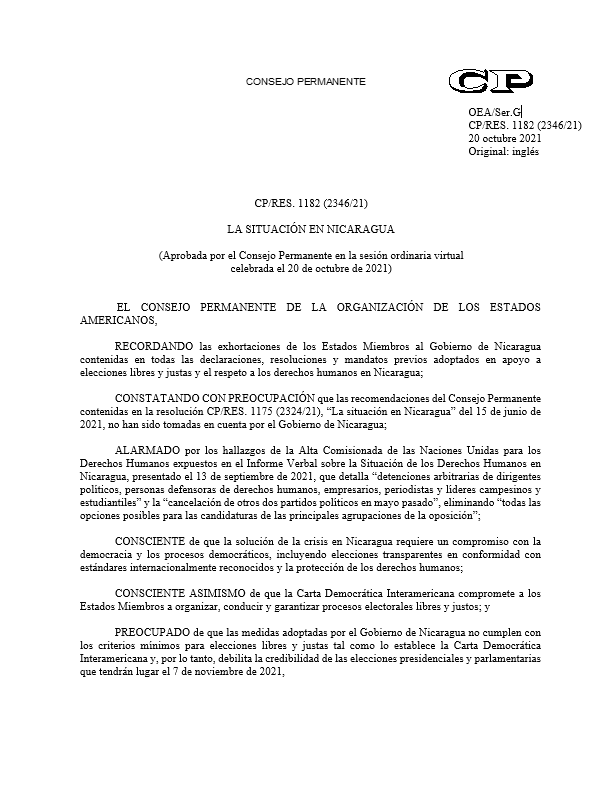 Resolución «La Situación en Nicaragua» aprobada por el Consejo Permanente de la OEA