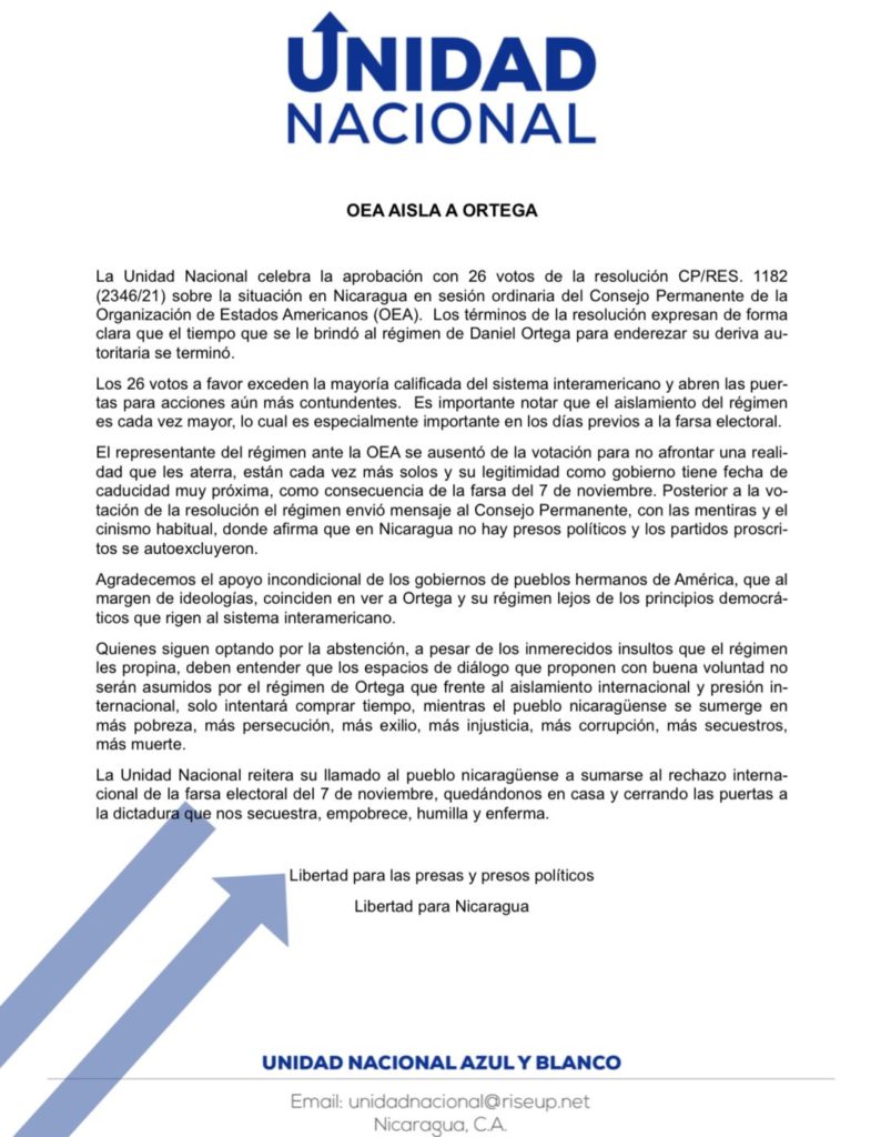 Piden tomar nota «con alarma del deterioro de la situación de los derechos políticos y derechos humanos en Nicaragua y del empeño del Gobierno de Nicaragua de minar el proceso electoral».