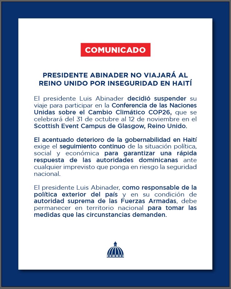 eudi 28 octobre 2021, le Porte-parole de la Présidence dominicaine, Homero Figueroa a informé de la décision du Président Luis Abinader de ne pas participer à la 26e Conférence des Nations Unies sur les changements climatiques (COP26 1er au 12 novembre à Glasgow, en Écosse) à cause de la grave crise qui sévit actuellement en Haïti et de la détérioration de la situation sécuritaire.