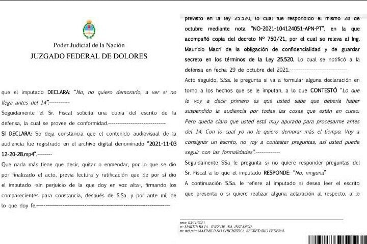 En una breve audiencia en el juzgado federal de Dolores, Macri y su abogado Pablo Lanusse presentaron el escrito, en tanto que el exmandatario se negó a responder preguntas.
