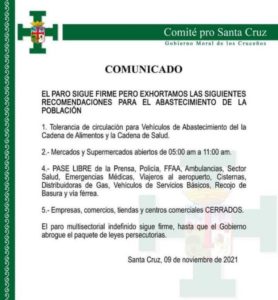 “Vamos a seguir con este paro, vamos a seguir charlando con diversos sectores para seguir con esta lucha”, anunció el presidente del Comité Pro Santa Cruz, Rómulo Calvo, en un contacto con la prensa.