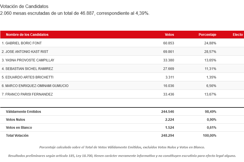 Según datos del Servicio Electoral, José Antonio Kast aventaja a Gabriel Boric, con menos del 5% de las mesas escrutadas en Chile.