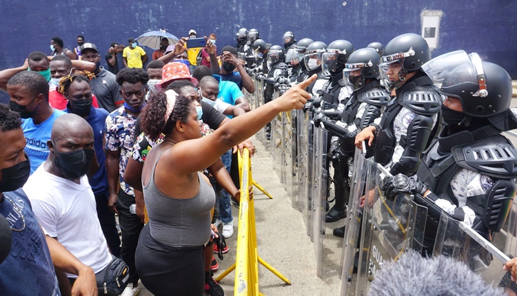 Luis García, uno de los líderes de la marcha, denunció a la agencia Reuters que dos migrantes fueron golpeados durante el enfrentamiento, que se generó cuando los agentes intentaron encapsularlos con sus escudos.