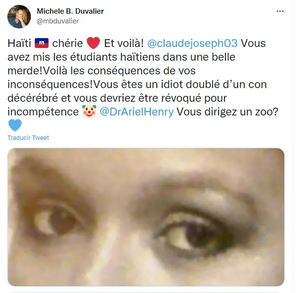 “¡Haití querido, ahí tienes! Claude Joseph ¡Has metido en un lío a los estudiantes haitianos! ¡Aquí están las consecuencias de tus inconsistencias! ¡Eres un idiota descerebrado y deberías ser despedido por incompetente, Ariel Henry, ¿dirige usted un zoológico?”, escribió Duvalier en su cuenta de Twitter.