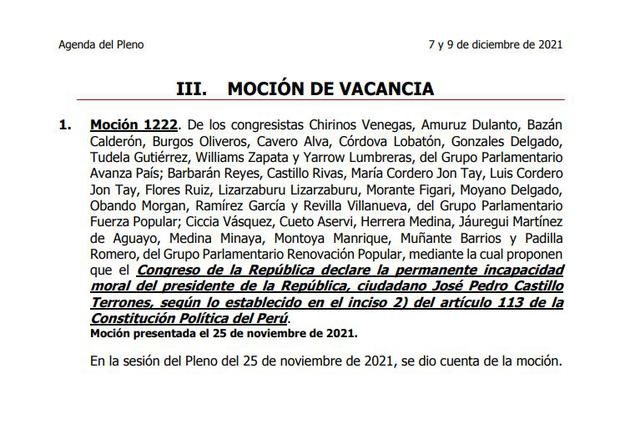 De acuerdo con la Junta de Portavoces, la moción se sustentará por 10 minutos y luego cada vocero tendrá el mismo tiempo para exponer su posición. Ya Perú Libre anunció que votará en contra.