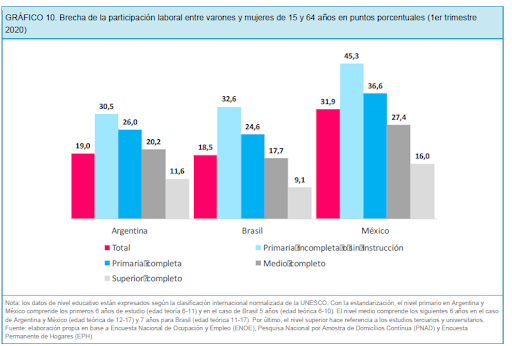 Según un estudio realizado en base a la Encuesta Permanente de Hogares, la brecha entre varones y mujeres disminuye a medida que avanzamos en el nivel educativo. Por otro lado, en instituciones de alto nivel educativo, como las Universidades e instituciones científicas, la participación laboral de las mujeres es menor.