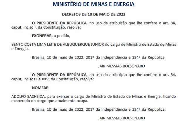 O presidente Jair Bolsonaro nomeou Adolfo Sachsida como Ministro de Minas e Energia no lugar de Bento Albuquerque, que foi exonerado a pedido. As decisões foram publicadas no «Diário Oficial da União» desta quarta-feira (11).