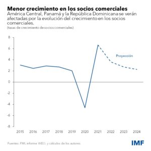 Algunos de estos otros factores son una mayor volatilidad de los precios de las materias primas, ya que la región depende mucho de las importaciones de combustible; el debilitamiento del crecimiento en los socios comerciales, incluido Estados Unidos; condiciones de financiamiento más restrictivas debido a alzas más rápidas de las tasas de interés mundiales e internas; y una nueva moderación de las entradas de remesas, que son una ayuda vital para algunas economías.