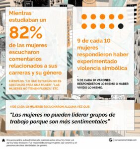 De acuerdo a una encuesta realizada por Grow-género y trabajo, la violencia simbólica afecta al 66% de las mujeres cis, al 61% de las personas de otras identidades y al 29% de los varones cis.